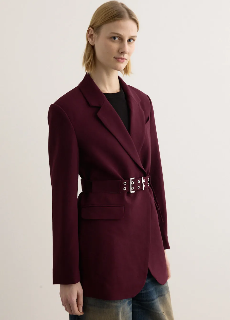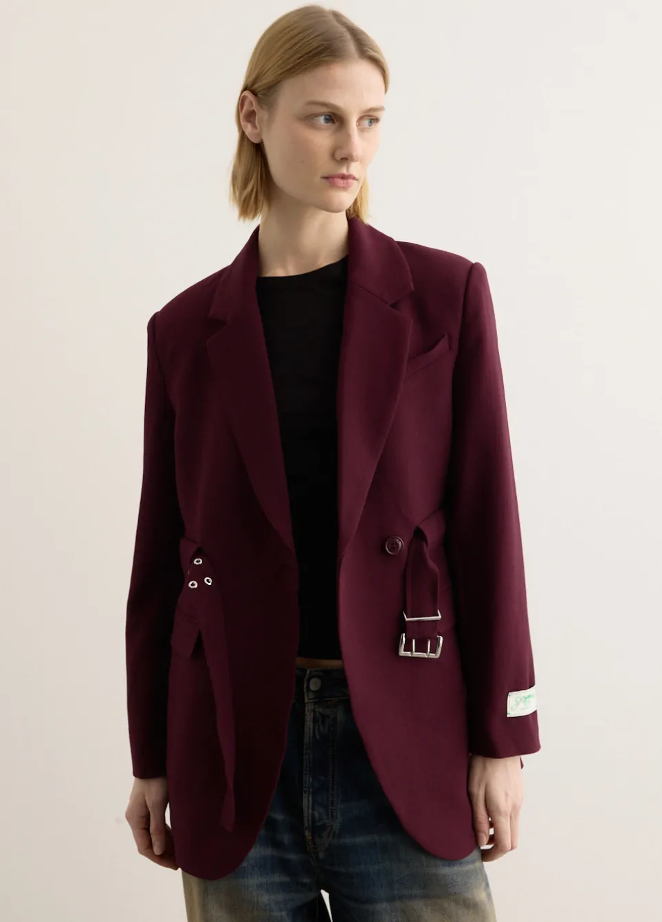 Danish label Ganni blends streetwear trends with a playful touch of humour through bold prints and colour palettes, voluminous silhouettes and easy-to-wear fabrics. Crafted from a dense poly-viscose blend, the Future Twill Suiting Blazer is tailored to an oversized silhouette. Featuring structured shoulders, notched lapels, two front flap pockets, finished with a logo label on the cuff and a tonal belt with the brand’s signature eyelet details.