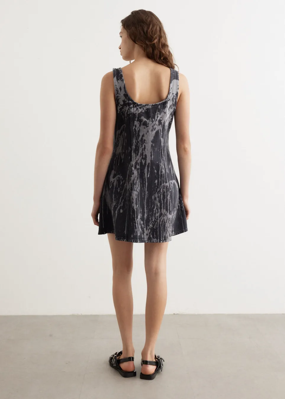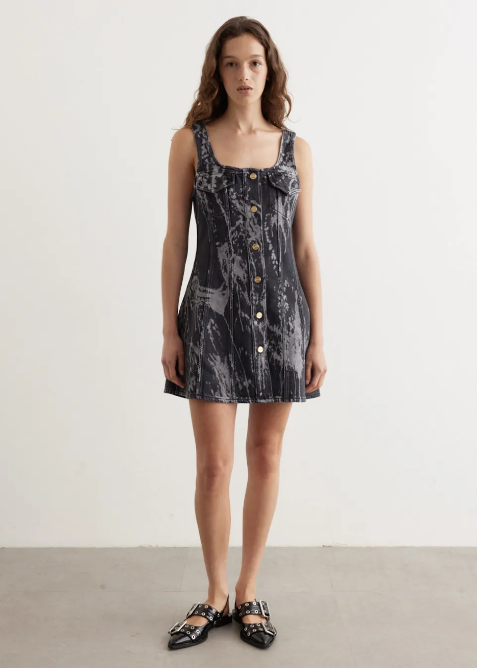 Danish label Ganni blends streetwear trends with a playful touch of humour through bold prints and colour palettes, voluminous silhouettes and easy-to-wear fabrics. Crafted from heavyweight, non-stretch organic cotton denim, the Heavy Denim Mini Dress features a deep square neckline, front Butterfly logo button closure and is adorned with an all-over marble wash effect.