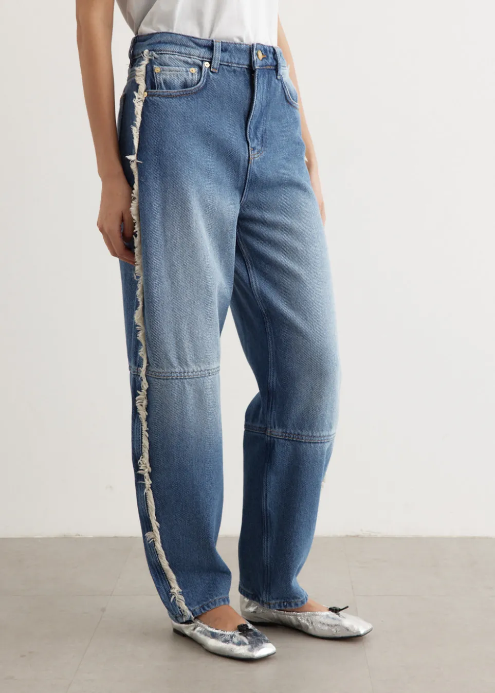 Danish label Ganni blends streetwear trends with a playful touch of humour through bold prints and colour palettes, voluminous silhouettes and easy-to-wear fabrics. Crafted from heavyweight, rigid denim, the Heavy Denim Stary Jeans feature a voluminous curved leg with a high-rise cut, ideal for a snug waist fit and comfortable through the hips and thighs. It features distressed detailing on the side of legs for an elevated touch.
