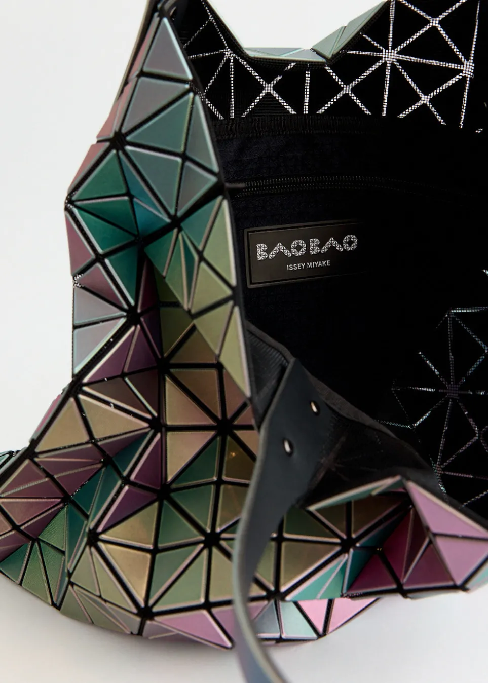 Introduced in 2000, Bao Bao is a part of the Issey Miyake label and captures the brand’s highly conceptual aesthetic of sculptural quality and bold colour palettes in a collection of small accessories and bags. Crafted with iridescent triangle vinyl appliques, the Illusion 10×10 Tote Bag boasts a multi-coloured reflection, creating an illusion effect. Featuring adjustable top handles and finished with an interior pocket with a logo tag.