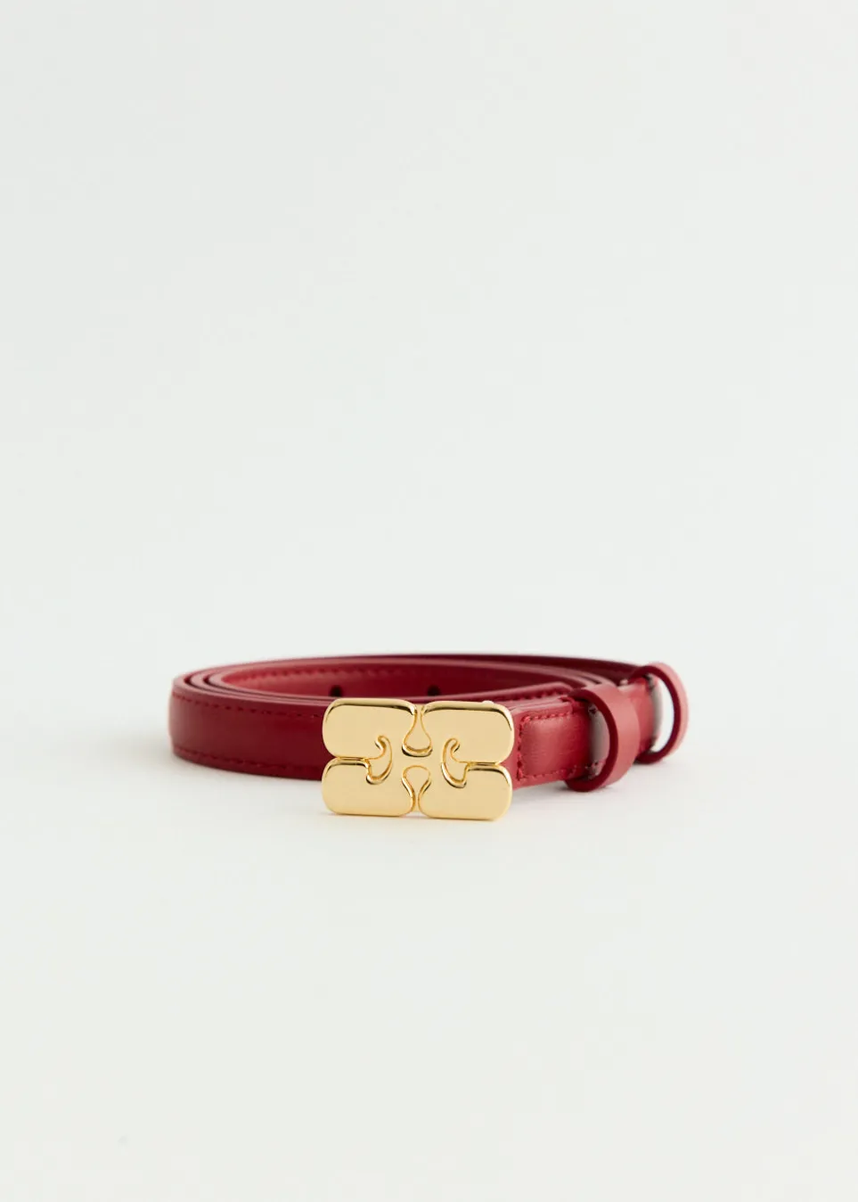 Danish label Ganni blends streetwear trends with a playful touch of humour through bold prints and colour palettes, voluminous silhouettes and easy-to-wear fabrics. Designed with a matte finish, the Kat Belt delivers a sleek, everyday staple. The belt is designed with a five-hole regulation and is adorned with a gold-tone GANNI Butterfly logo buckle for a unique branded touch.