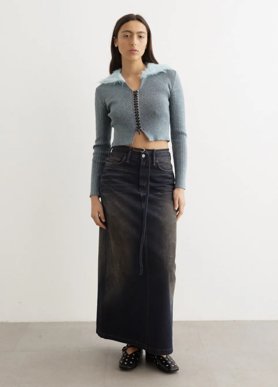 The identity of Andersson Bell was inspired by the merge of two contrasting cultures, reinterpreting Scandinavian aesthetic to create garments from a Korean perspective. The Lace-Up Knit Cardigan is tightly knitted for a slim fit and is distinct with its furry collar and a faux lace-up detail at the centre.