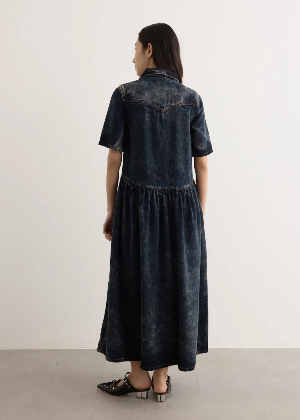 Danish label Ganni blends streetwear trends with a playful touch of humour through bold prints and colour palettes, voluminous silhouettes and easy-to-wear fabrics. Crafted from a lightweight lyocell denim, the Light Denim Long Dress features an all-over washed denim finish, a classic collar, short sleeves, half button-down placket and a panelled front bodice. Finished with two chest patch pockets with buttoned flaps.
