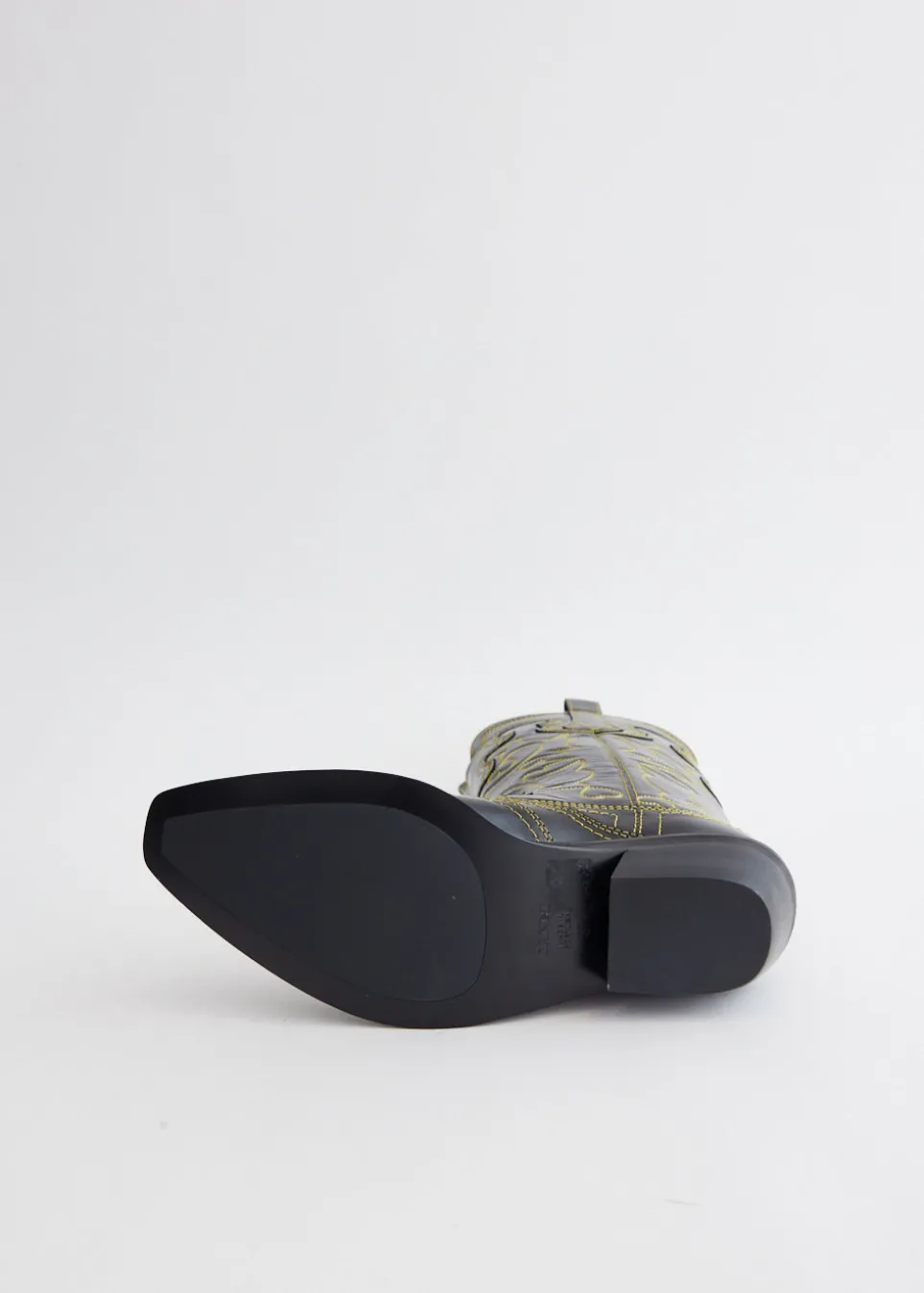 Danish label Ganni blends streetwear trends with a playful touch of humour through bold prints and colour palettes, voluminous silhouettes and easy-to-wear fabrics. The Mid Shaft Embroidered Western Boots is a contemporary take on the cowboy style. Crafted from leather, the embroidered stitching accents the sleek, mid shaft. It sits atop a cuban heel for a touch of height.