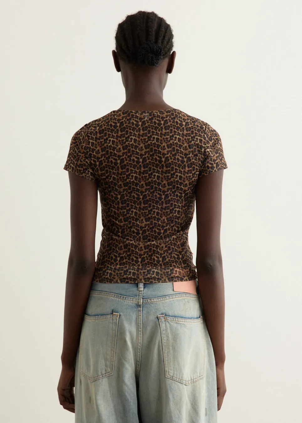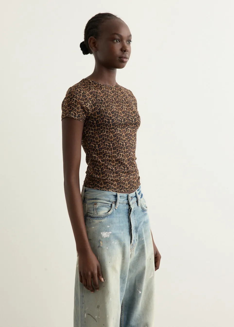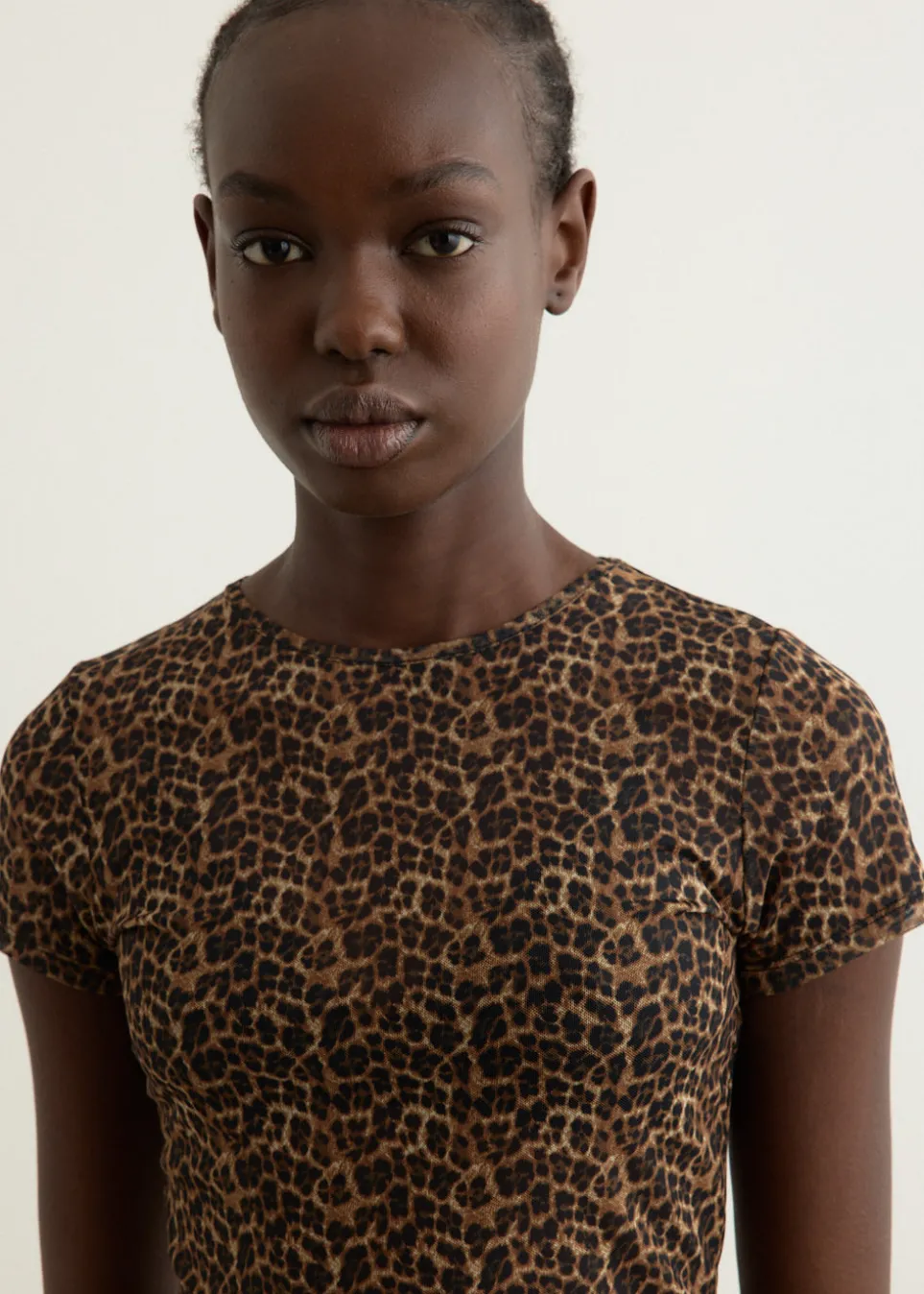 MIAOU was born where French-girl style meets Southern California-cool. The label takes vintage silhouettes and turns them into elevated, contemporary garments which echo supermodel style from the ’90s. Crafted from recycled polyester blend with light sheerness, the Mini T-Shirt features a leopard print throughout.