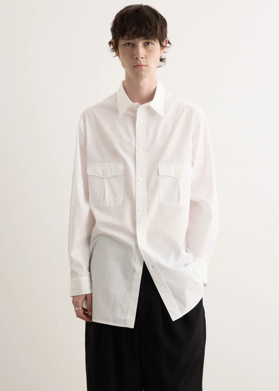 Y’s for men, founded by Yohji Yamamoto in 1979, combines functionality and elegance in menswear, reflecting Yamamoto’s design philosophy. The brand offers contemporary, avant-garde styles with monochromatic hues and masterful craftsmanship. Made from cotton broadcloth for a unique texture, the Out Pocket Shirt boasts a classic design, with a button front closure and pockets on the chest.