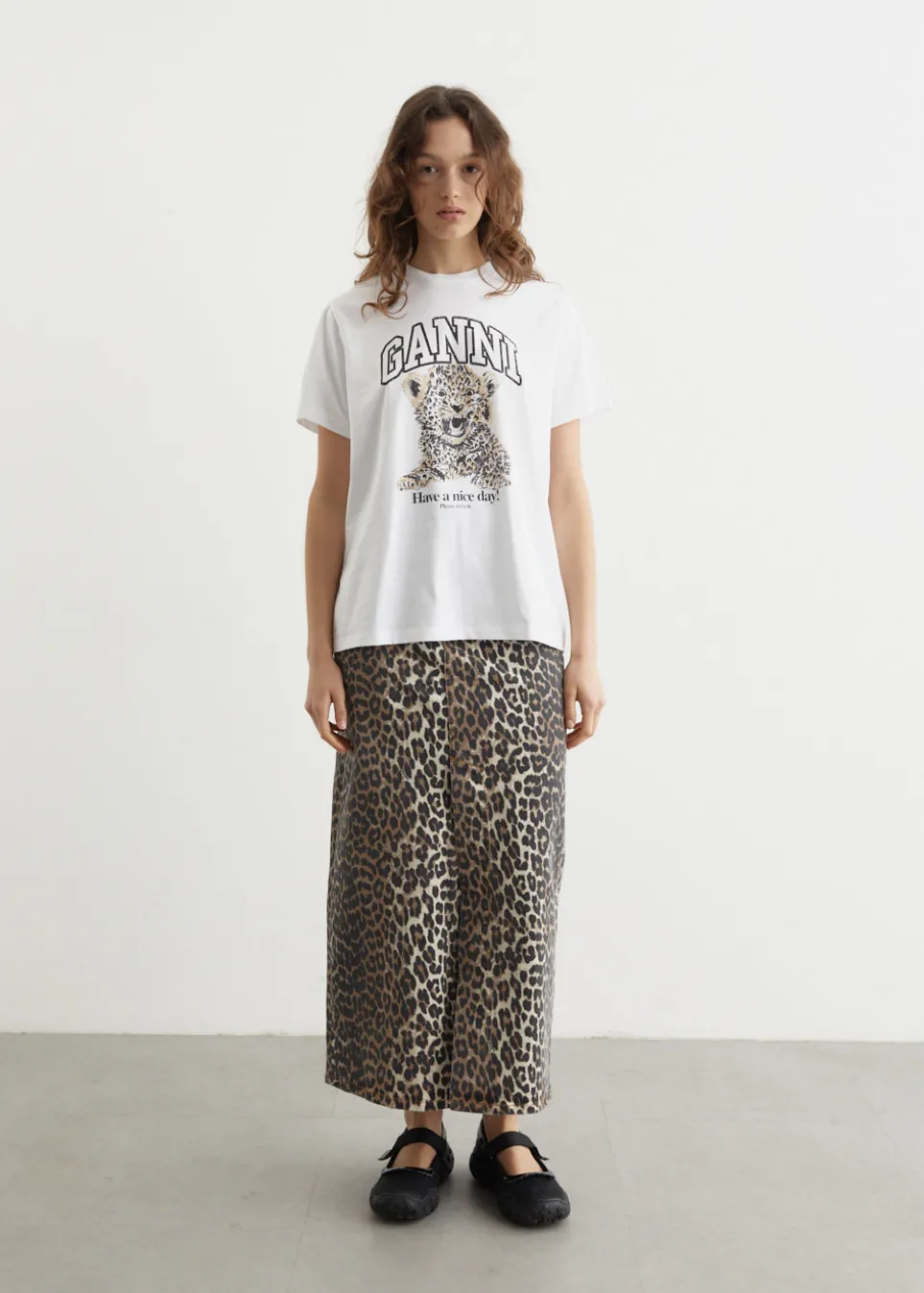 Danish label Ganni blends streetwear trends with a playful touch of humour through bold prints and colour palettes, voluminous silhouettes and easy-to-wear fabrics. Crafted from a stretch organic cotton blend, the Print Denim Maxi Slit Skirt. Designed for a regular fit and features a 5-pocket style with a zip and button closure.