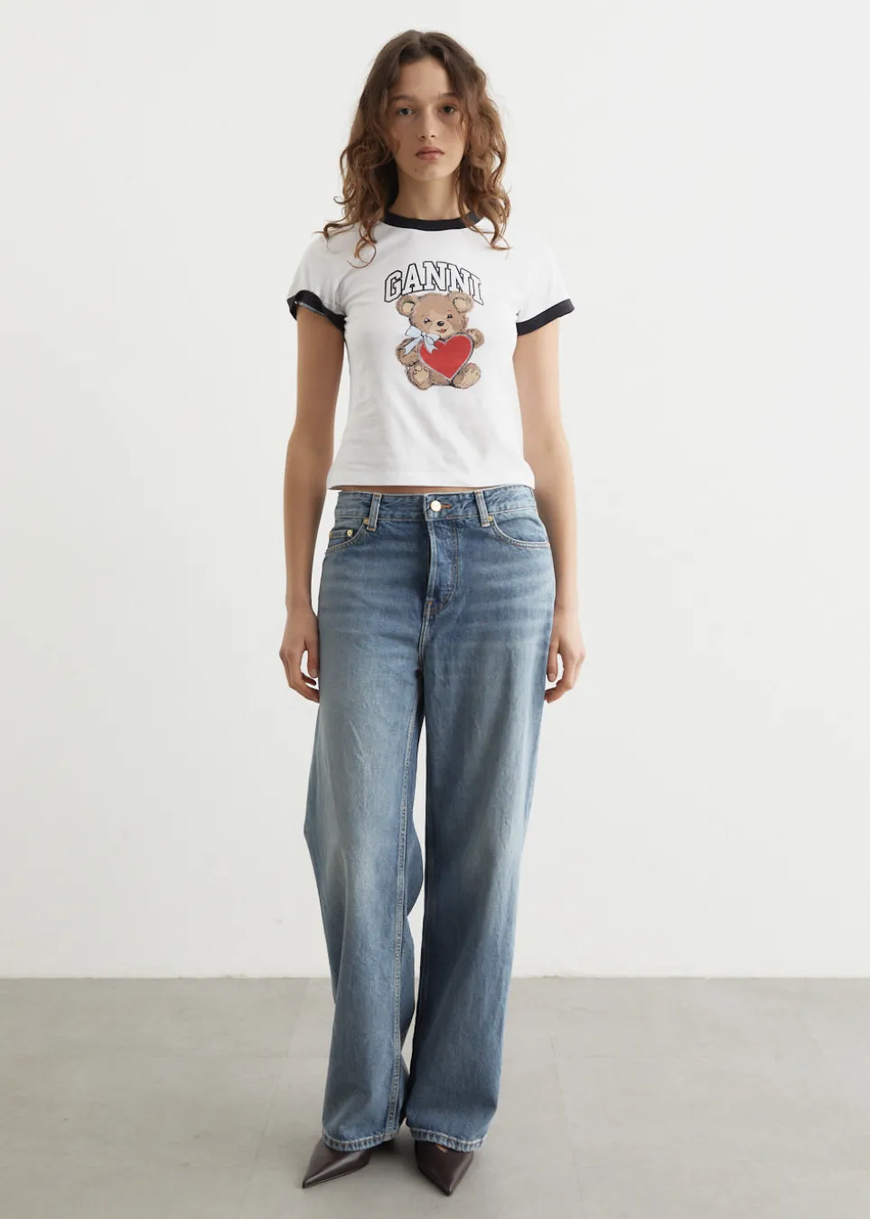 Danish label Ganni blends streetwear trends with a playful touch of humour through bold prints and colour palettes, voluminous silhouettes and easy-to-wear fabrics. Crafted from durable denim, the Rigid Denim Izey Jeans feature a mid to low-rise design and a relaxed, straight fit. The distressed fade and whiskering elements add a vintage feel, while the logo patch on the back pocket adds a branded touch.