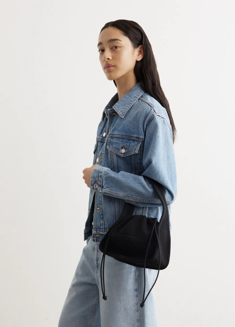 Inspired by elements of New York nightlife and street culture, Alexander Wang’s accessories are instant icons. Adorned with shimmering rhinestone embellishments and branded details, each piece in the collection sparks youthful spirit. Crafted from a polyester-nylon blend with a ribbed texture, the Ryan Small Bag features a ribbed texture and a convenient drawstring top closure. Its front is adorned with a printed logo, adding a touch of branding.
