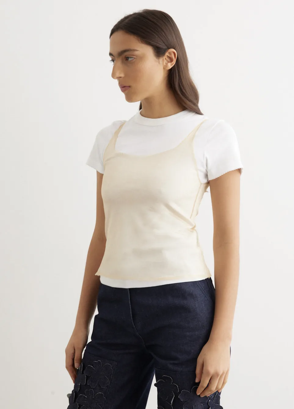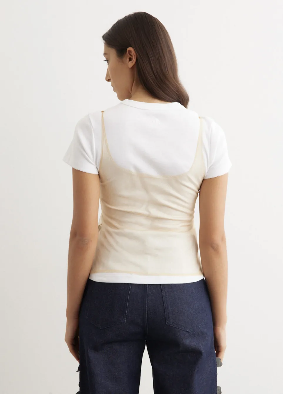 Founded in 2018 by twins Claudia and Sayana Durany, Gimaguas is powered by relationships and conversation. A focus on carefree silhouettes, bespoke prints, technical knitwear and craft-inspired detail. All Gimaguas pieces are designed in Barcelona. The See Tank Top is crafted from a delicate metallic and see-through fabric, offering a shimmering finish. Layer on top of t-shirts and shirts to add a feminine and sophisticated touch.