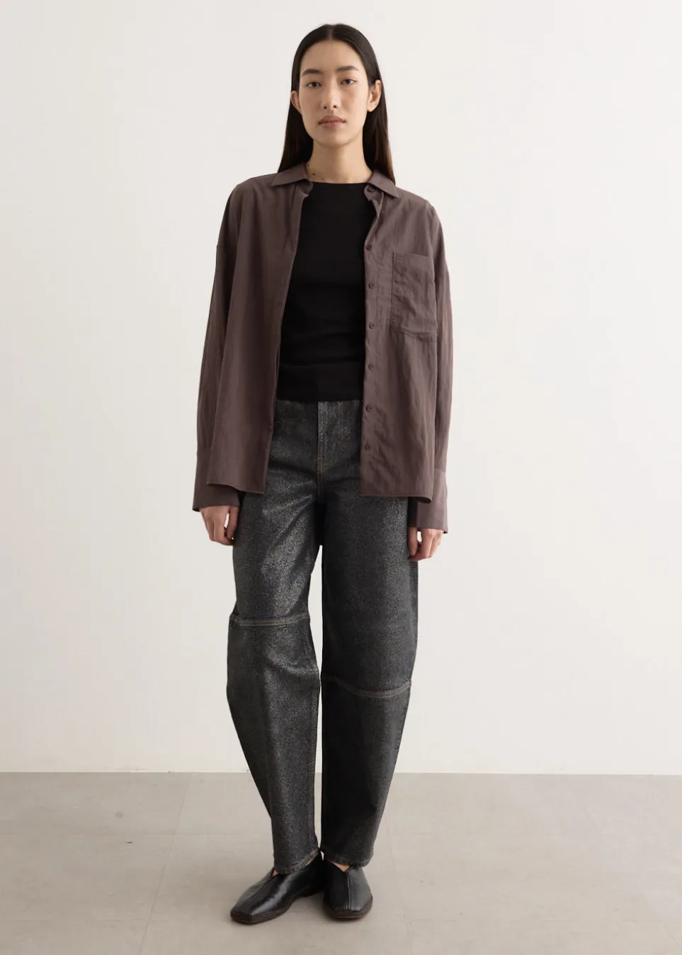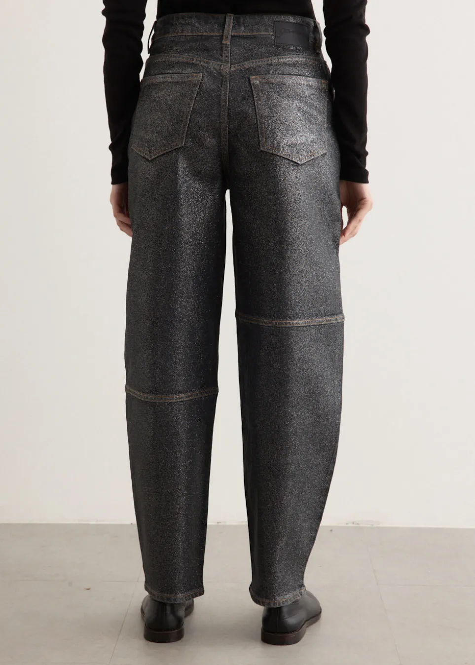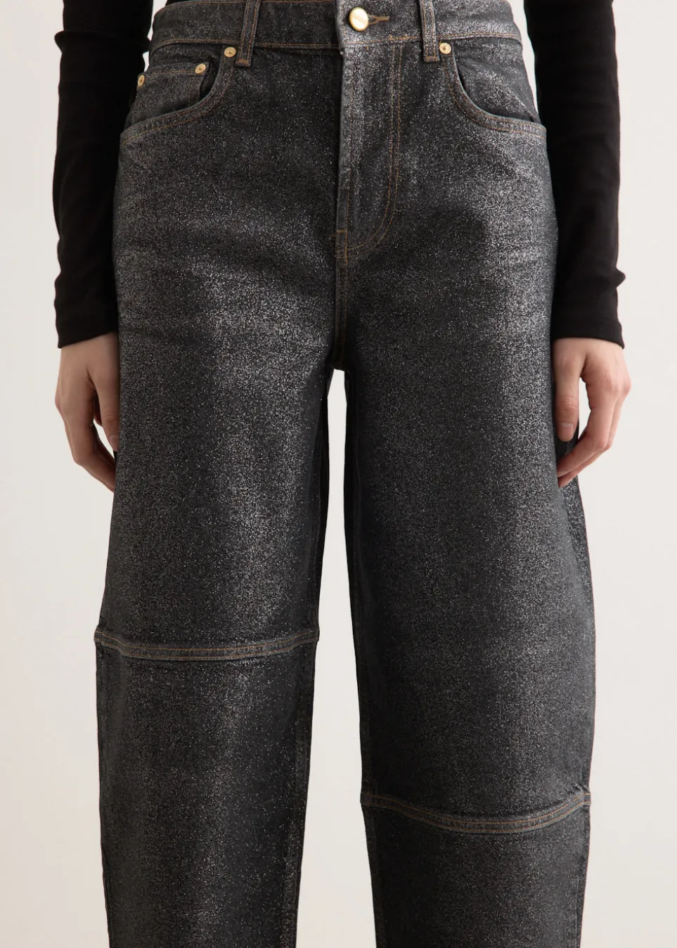 Danish label Ganni blends streetwear trends with a playful touch of humour through bold prints and colour palettes, voluminous silhouettes and easy-to-wear fabrics. Crafted from organic cotton denim, these jeans are finished with shimmery foil for a distinct but relaxed look. Pair with the Shimmery Foil Denim Fitted Blazer for a complete look.