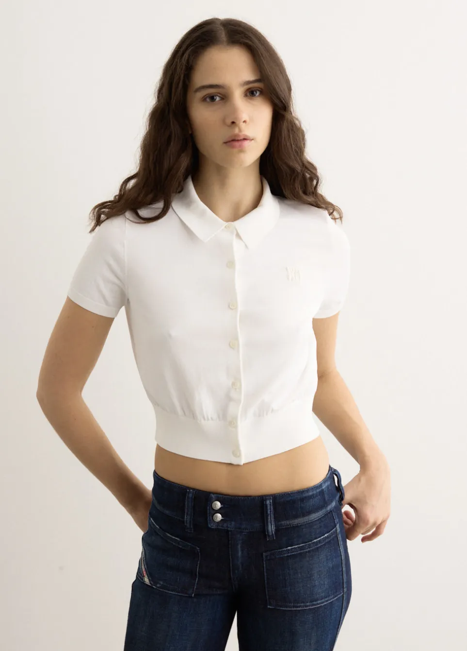 Inspired by elements of New York nightlife and street culture, accessories and apparel from Alexander Wang are instant icons. The Short Sleeve Polo Cardigan With Embroidered Logo is cut to a slim, cropped silhouette, featuring a polo neckline and button closure, finished with an embroidered logo on the chest.