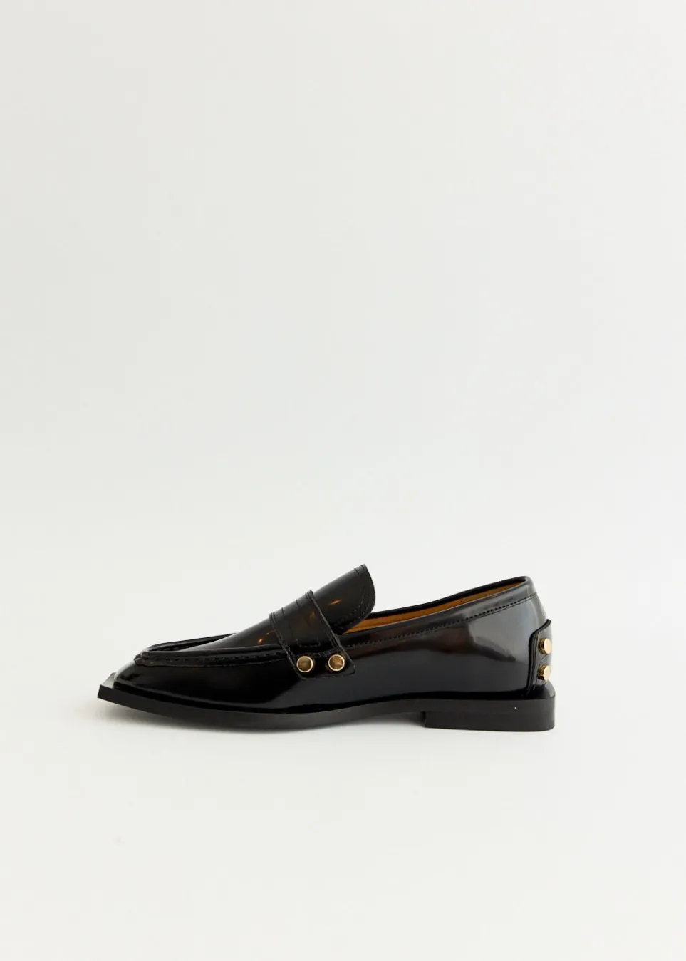 Danish label Ganni blends streetwear trends with a playful touch of humour through bold prints and colour palettes, voluminous silhouettes and easy-to-wear fabrics. Crafted from Oleatex with a glossy finish, the Studs Square Toe Loafers boasts a classic design with modern details. Featuring a square toe, detailed with gold studs at the back, offering a subtle edge to a timeless silhouette.