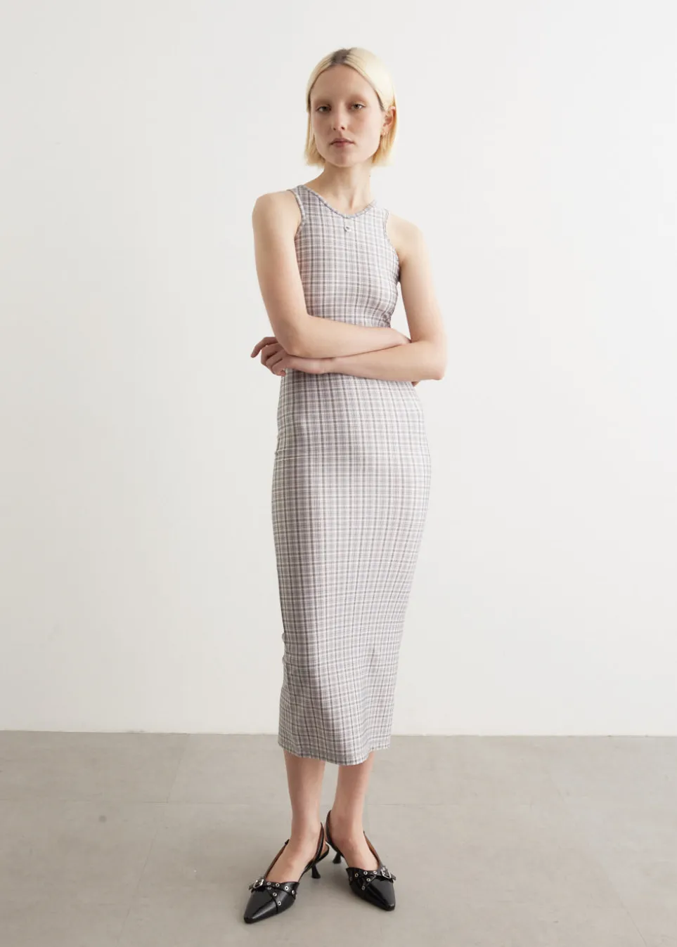 Coperni was established in Paris in 2013 by Sébastien Meyer and Arnaud Vaillant. The brand’s sleek version of minimalism is heavily influenced by the digital age, with a particular focus on asymmetry and structure. Made from high-sheen stretch fabric, the Tank Top Dress is cut to a midi length with a slim fit. It has a side slit for movement and is finished with a silver-tone C logo.