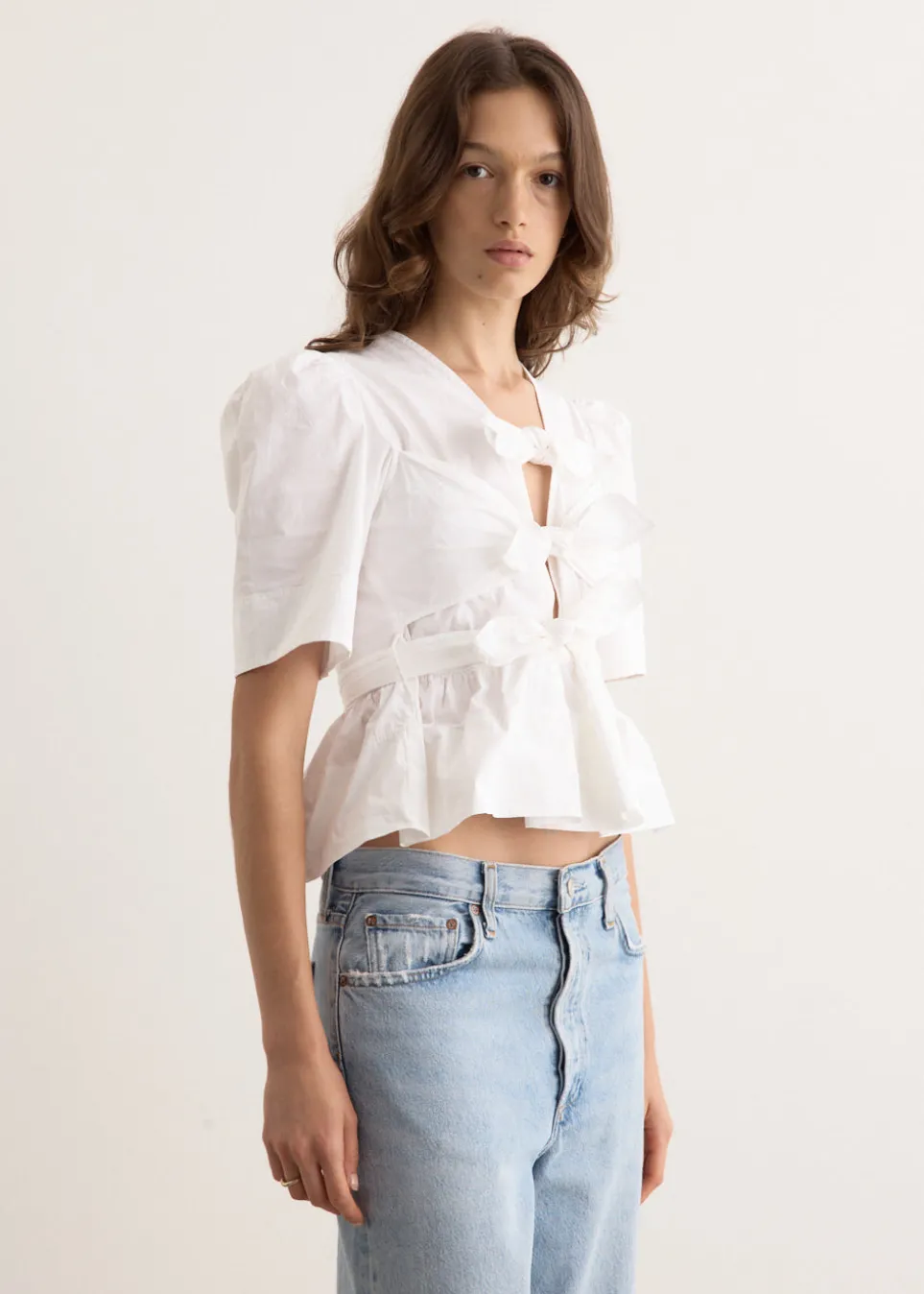 Danish label Ganni blends streetwear trends with a playful touch of humour through bold prints and colour palettes, voluminous silhouettes and easy-to-wear fabrics. Made from a cotton-elastane blend, the Washed Stretch Cotton Tie Strap Blouse features a deep v-neckline, complemented by three front tie straps.