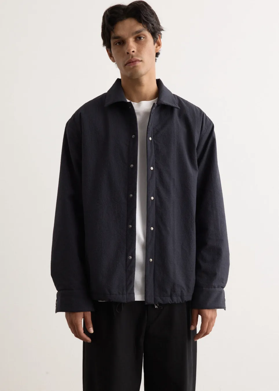 Incu Collection blends masculine and feminine styles creatively, offering refined tailored silhouettes and curated detailing for a unique and functional fashion statement. Crafted from a technical polyester with a micro-check patterned finish, the Wipeout Utility Overshirt features an collared neckline and front snap button closure, finished with fleece lining and a relaxed fit to ensure comfort and warmth without sacrificing style.