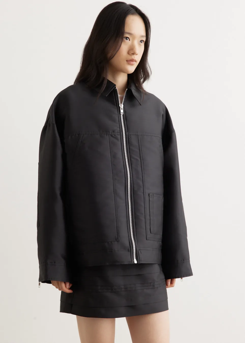 Cecilie Bahnsen partners with Nona Source to create a limited apsule collection, crafted from LVMH’s deadstock fabrics. The collaboration celebrates a shared dedication to sustainable design, reimagining iconic silhouettes and responsible craftsmanship. Crafted from a polyester-silk blend, the Olpa Jacket is an oversized piece with a zip closure and front patch pockets. Its timeless design blends style and functionality effortlessly.